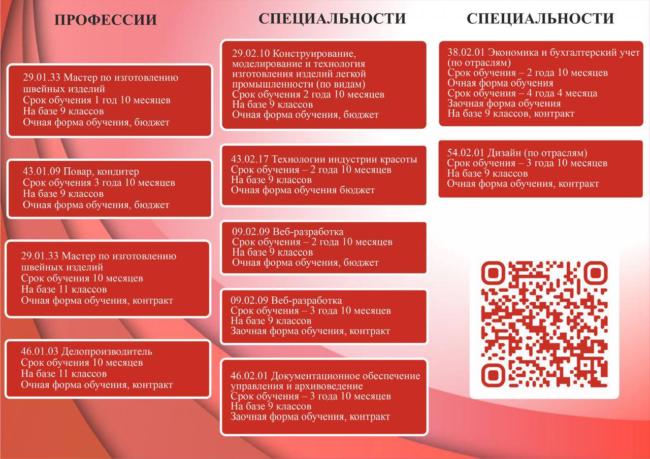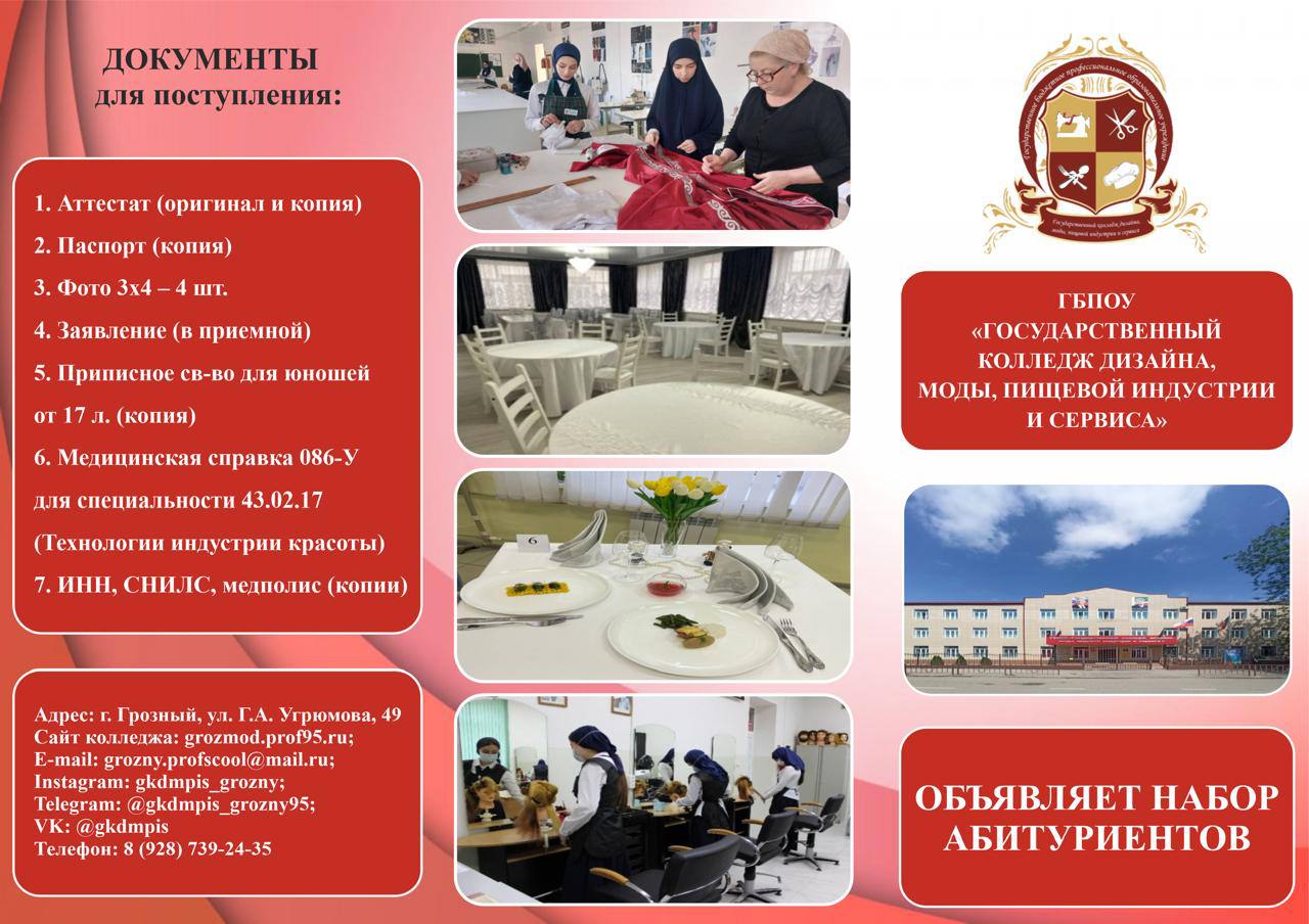ГБПОУ «Государственный колледж дизайна, моды, пищевой индустрии и сервиса» открывает свои двери выпускникам школ 9-х и 11-х классов! Высококвалифицированный педагогический коллектив и усовершенствованная техника и технология преподавания в колледже, позволит Вам стать специалистами высокого профиля по самым актуальным специальностям и профессиям на сегодняшний день. В 2024 году «Государственный колледж дизайна, моды, пищевой индустрии и сервиса» объявляет набор абитуриентов по следующим специальностям: 1. 43.02.17 Технология индустрии красоты; 2. 29.02.10 Конструирование, моделирование и технология изготовления изделий легкой промышленности (по видам); 3. 54.02.01 Дизайн (по отраслям); 4. 38.02.01 Экономика и бухгалтерский учет (по отраслям); 5. 46.02.01 Документационное обеспечение управления и архивоведение; 6. 09.02.09 Веб-разработка. Профессии: 1. 29.01.33 Мастер по изготовлению швейных изделий; 2. 46.01.03 Делопроизводитель; 3. 43.01.09 Повар, кондитер. Выпускники становятся специалистами высокого класса. Образование, полученное в стенах колледжа, обеспечит Вам высокий профессионализм, позволит трудоустроиться без препятствий, быть социально значимыми в разных отраслях человеческой деятельности. ГБПОУ «Государственный колледж дизайна, моды, пищевой индустрии и сервиса» ждёт Вас!